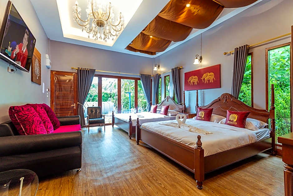 This luxurious family room provides a private pool, a hot tub and a spa bath. The spacious family room offers air conditioning, a private entrance, a terrace with garden views as well as a private bathroom boasting a walk-in shower. The unit has 3 beds.