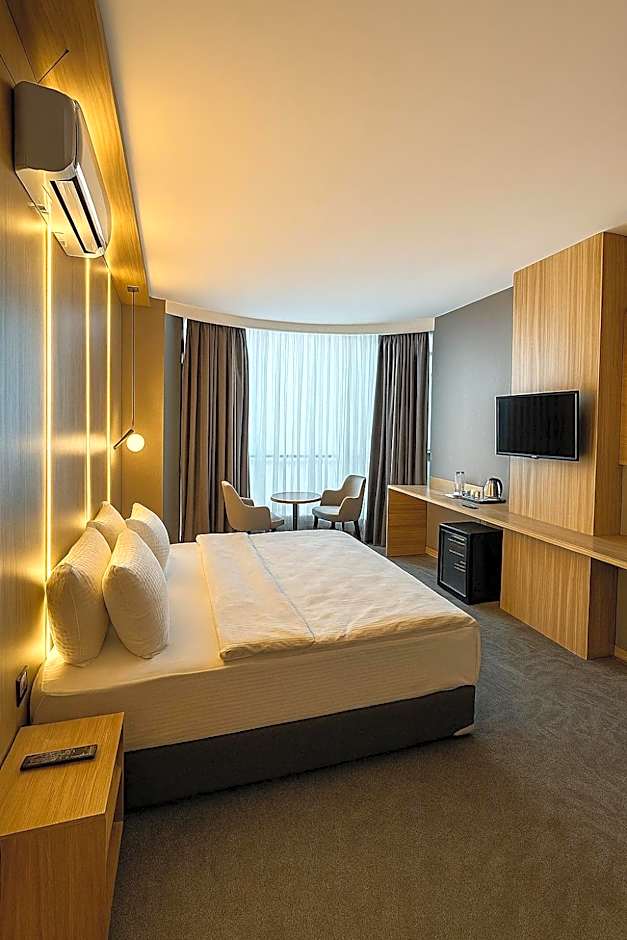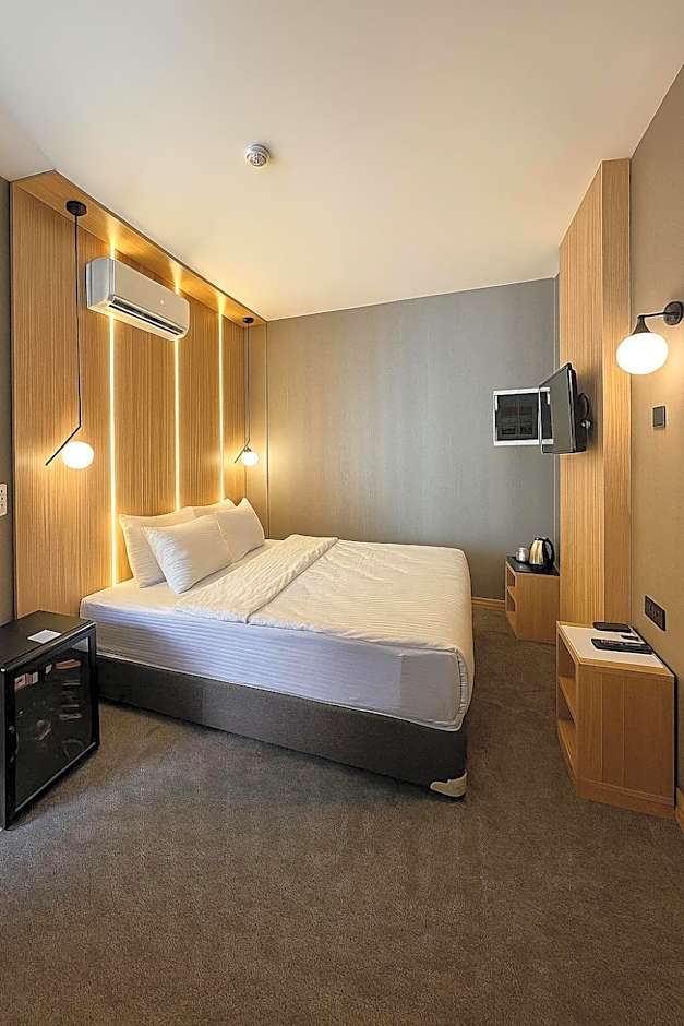 The spacious air-conditioned double room features a flat-screen TV with cable channels, soundproof walls, a mini-bar, a tea and coffee maker as well as city views.