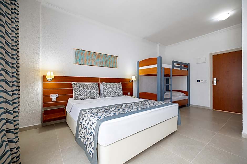 is a four-star retreat nestled on the Bodrum coast in Turkey. This beachfront getaway blends relaxation with splashy fun, featuring a free water park, a private beach area, and an outdoor pool that stays cool under the sun. Free kids' club access and a waterslide add a playful touch, while air-conditioned rooms keep things comfortable after a day under the Mediterranean sky.