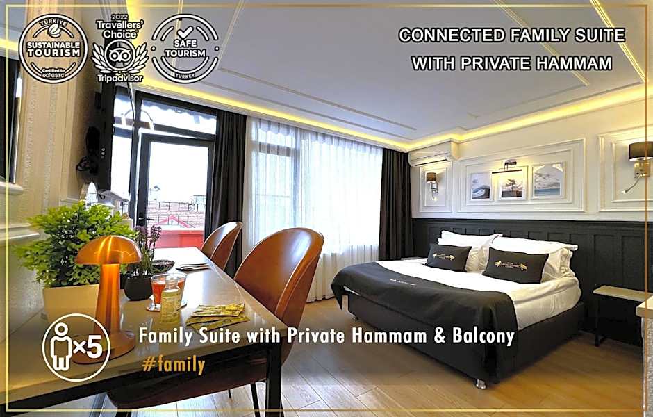 This nonsmoking connected family suite offers air-conditioning. It also offers a balcony. Private bathroom comes with a private hamam (works with heating system of the hotel, there is no seperate heating system) and shower. Room rate includes: - Free mini-bar in the room including soft drinks and snacks - Smart TV with free Netflix - Open-buffet breakfast from 08:00 until 10:30 at the Angel's Home Hotel Roof Terrace - Complimentary patisseries, coffee and tea from 10:00 until 23:00 - Private check-in and check-out. To the rooms can be accessed via stairs only. No elevator.