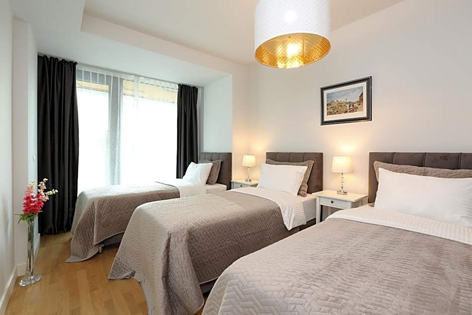 This apartment offers a sauna. Featuring a private entrance, this air-conditioned apartment consists of 1 living room, 2 separate bedrooms and 1 bathroom with a walk-in shower and a bidet. Meals can be prepared in the kitchen, which comes with a stovetop, a refrigerator, a dishwasher and kitchenware. The spacious apartment provides a washing machine, soundproof walls, a mini-bar, a flat-screen TV with cable channels, as well as city views. The unit offers 5 beds.