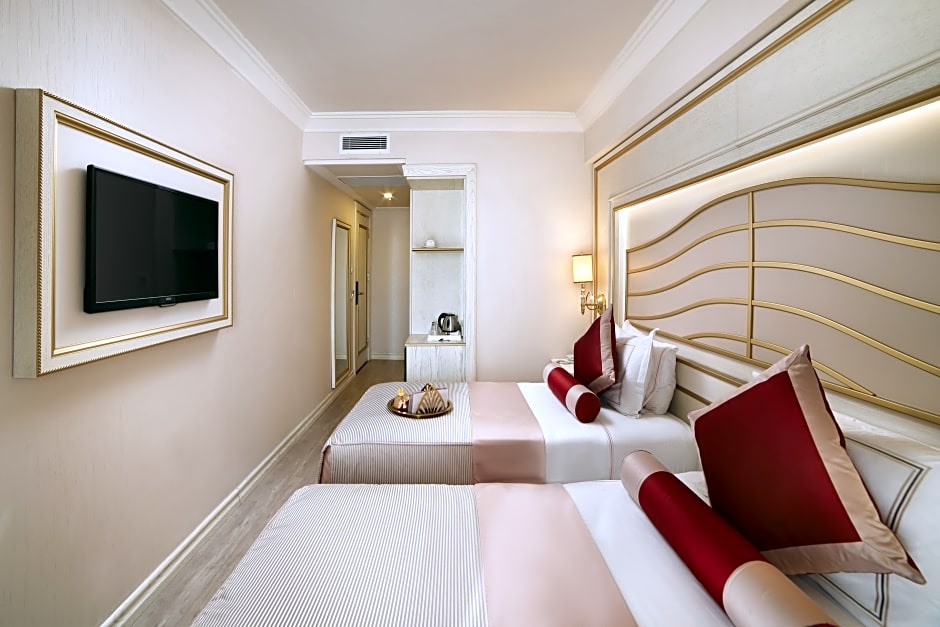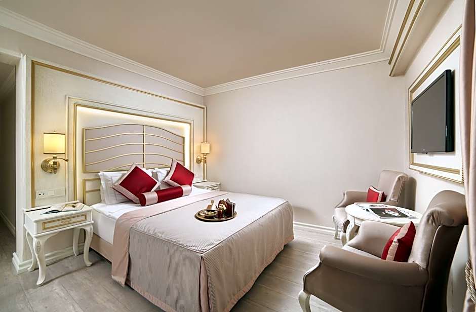Double Deluxe Room is 312 square feet and includes either a double bed 131-150 width or 2 single beds 80-130 width plus extra beds on demand, desk, satellite tv , hairdryer, tea and coffee making facilities , ironing set, safe, bathrobes, and slippers and is Wheelchair-accessible.