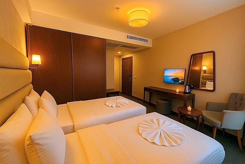 This air-conditioned twin/double room is consisted of of a flat-screen TV with satellite channels, a private bathroom as well as a balcony with city views.