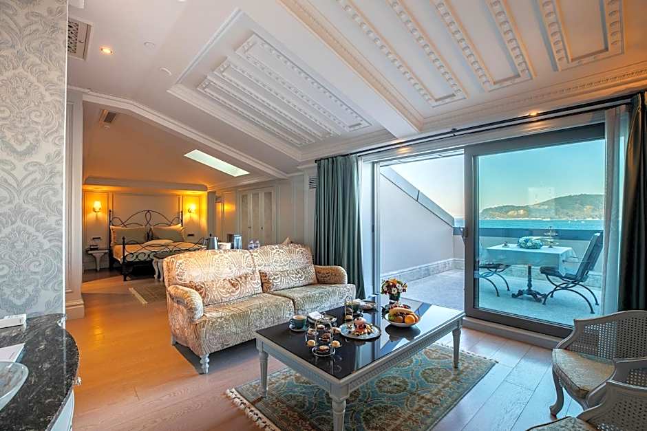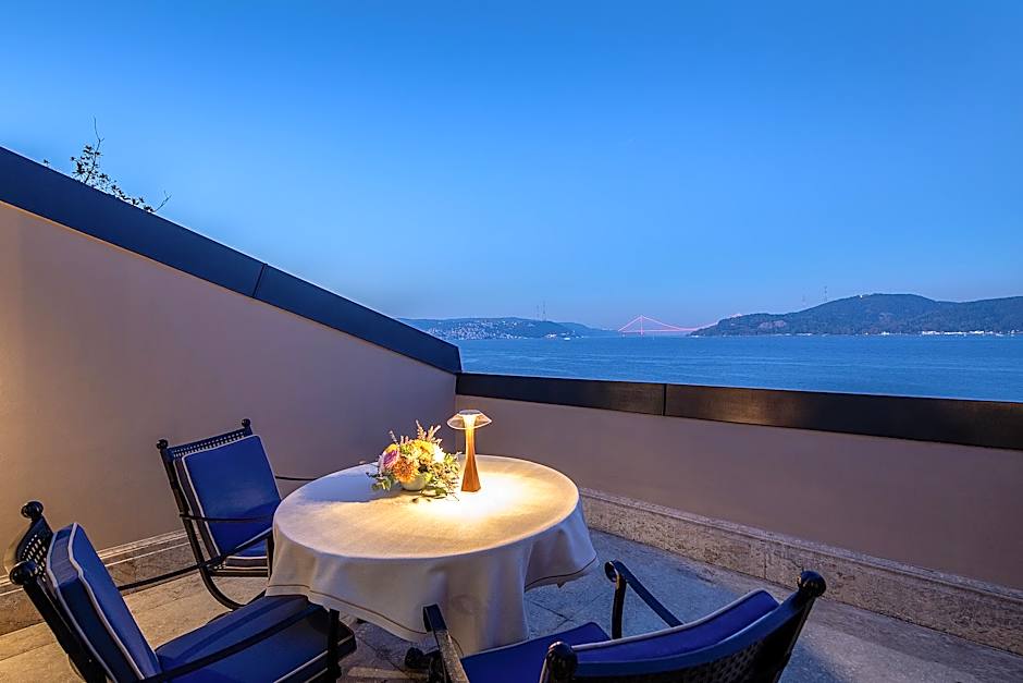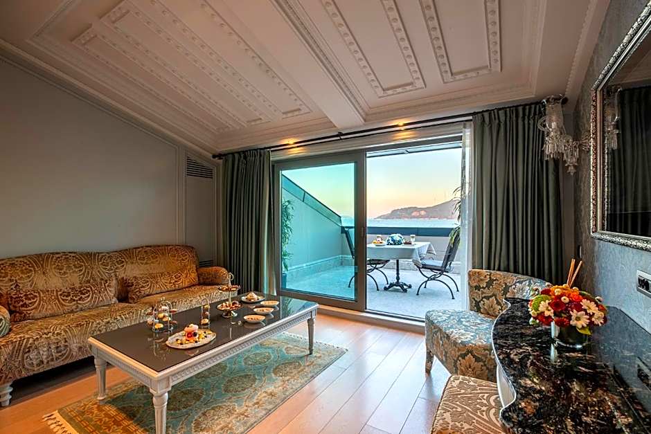 This luxurious suite features a ceiling graced with Seljuk motives, elegant wallpaper and parquet floors. It is furnished with a nostalgic wrought iron bed with a comfortable mattress, and a chic working desk. It offers extensive views of the Bosphorus. It also includes a LED, which has a special frame which can also be used as a mirror. The spacious bathroom is covered with beautiful marble and granite natural stones.