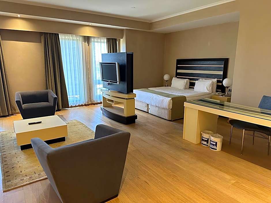 Decorated in contemporary style, this spacious suite offers a seating area, flat-screen TV and a mini-bar. It also includes a dining area.