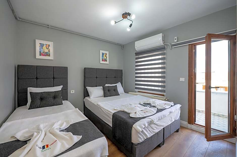 Taxim Trend Suites offers a diverse lineup of apartment- and suite-style options, ranging from compact 1-bedroom layouts to larger 2-bedroom and 4-bedroom configurations. Highlights include Apartment, Groundfloor; Apartment, 2 Bedroom; Apartment, 2 Bedroom, Balcony; Suite, City View; and Suite, Terrace, among others. Most units accommodate two adults and one child, with bed configurations that include twins, doubles, queens, and sofa beds to suit families and friends.