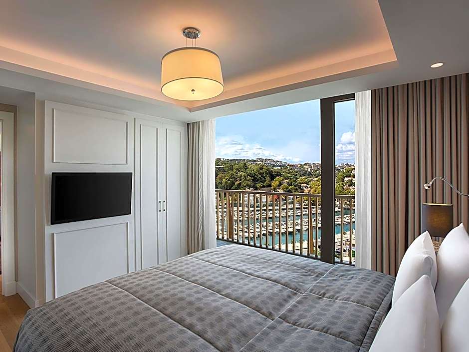 Overlooking to Tarabya Bay and marina, this tastefully decorated spacious suite has an open-plan living room and private balcony with marina view. It features multi-channel satellite TV, curtain controls, electronic safety box and refrigerated private bar. Guests can find uniquely furnished bathroom with separate marble bathtub and shower with internal glass window panel, hairdryer and special toiletries. Ergonomic desk chair, discreet business desk and one rollaway bed are available in the room. Tea&coffee facilities can be provided upon request.Turndown service is also available for guests.