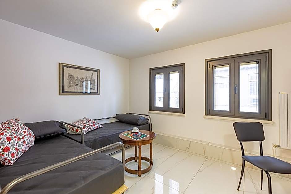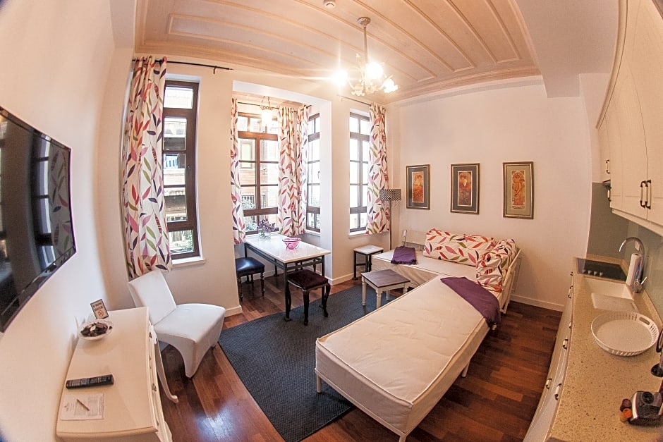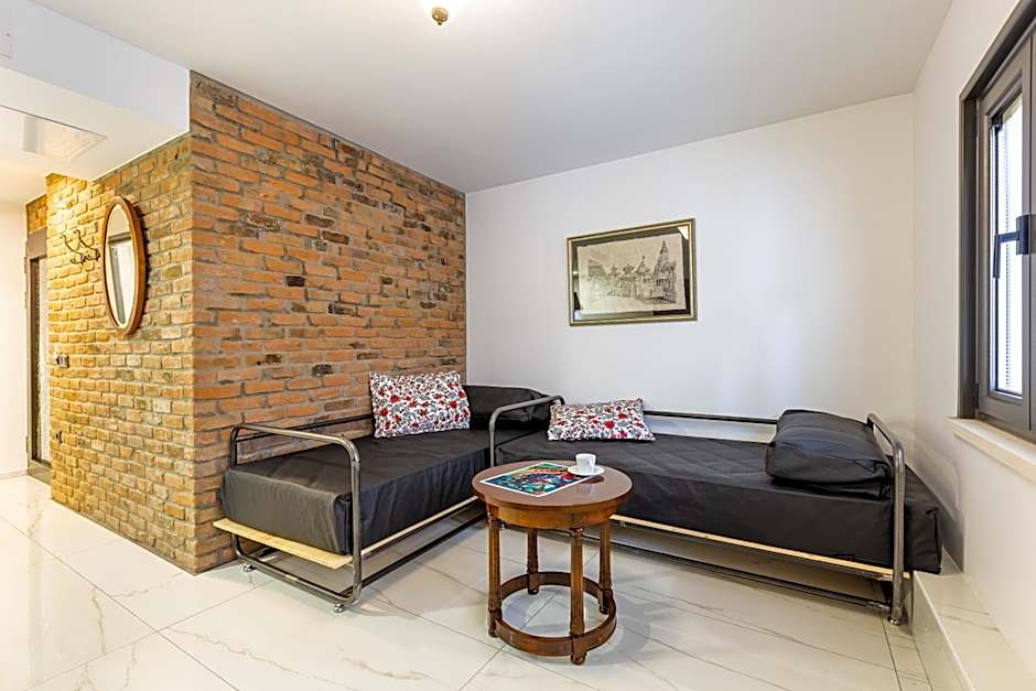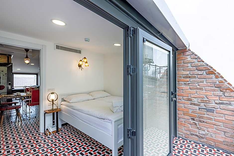 This room locates in the authentic annex building which is 230 feet away from the main building. Existing on the top floor, this spacious suite features opaque glass ceiling in the living room. It includes a bedroom with 1 double bed, and a living room with 2 single sofa beds with a kitchenette consisting fridge, electrical stove, dishwasher, kettle, coffee machine and kitchenware. The suite also features air conditioning, heating, Led TV with satellite channels, free high-speed internet, laptop size safety box, wardrobe and dining table. The modern private bathroom comes with a hair dryer, free toiletries and slippers. Baby crib upon request is available in this room type. Please note that there is no elevator in the annex building, and loft suites exist on the 2nd or 3rd floor. Breakfast will be served in the main building.