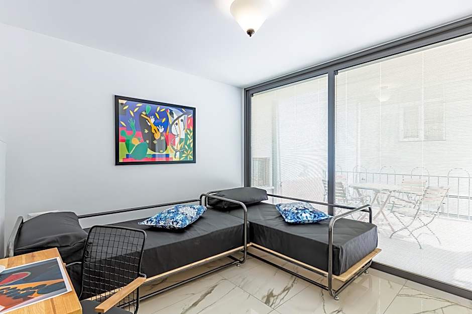 In this suite there exists a bedroom with glass walls and inside with 1 large double bed. The other part consists from 2 single beds and open-plan kitchenette with fridge, electrical stove, compact dishwasher, kettle and kitchenware. The suite also features air conditioning, central heating, Led TV with satellite channels, free high-speed internet, laptop size safety box, wardrobe and dining table. The modern private bathroom comes with a hair dryer, free toiletries and slippers. Baby crib upon request is available in this room type. Breakfast will be served in the main building.