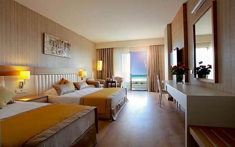 This resort is a dream destination for families and couples alike, with a range of amenities to enjoy. From a free water park and private beach area to a spa offering wellness packages, there is something for everyone. Indulge in the indoor and outdoor swimming pools, Turkish bath, sauna, and fitness center. The little ones will love the kids' club and pool, while adults can relax with water sports, live music, and beachfront lounging. With free Wi-Fi and room service, your stay at Adalya Ocean Deluxe - Ultra All Inclusive will be nothing short of exceptional.