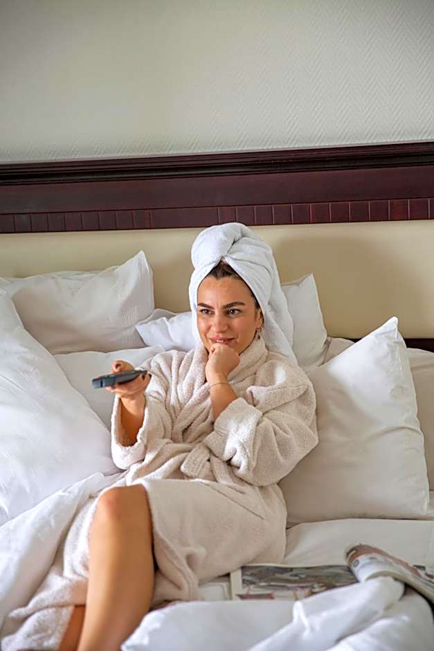 Free amenities set the tone for relaxation: an outdoor swimming pool and a kids' pool, free wifi, and free on-site parking. Spa lovers can enjoy a free spa, Turkish/steam bath, steam room, and sauna, while air conditioning and soundproof rooms ensure a cool, quiet stay. Beach umbrellas and chairs, a garden, and elevator access complete the practical laid-back setup.