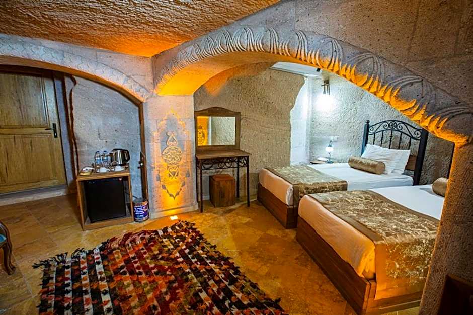 Decorated with art pieces of Cappadocia symbols, this cave suite is carved into the rocks. It has a seating area with traditional sofas. Bathroom is carved into the rocks and built by natural stones.