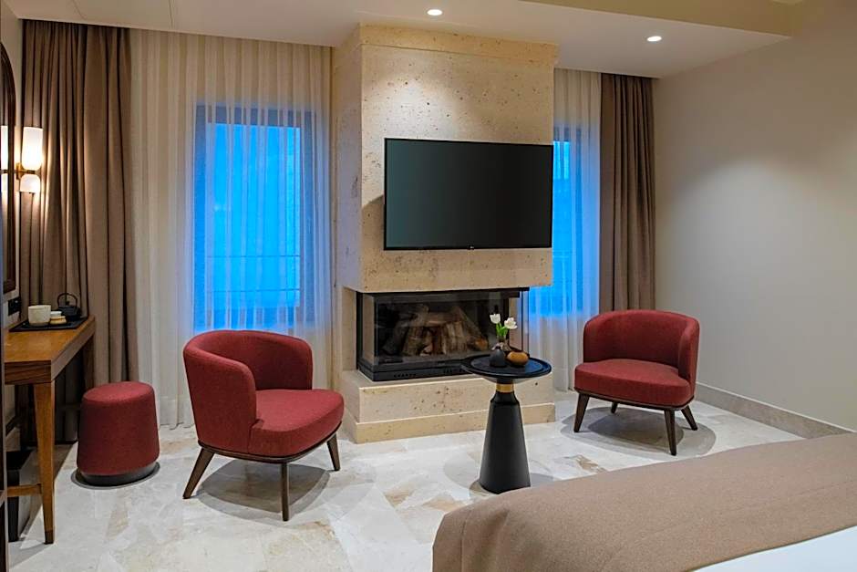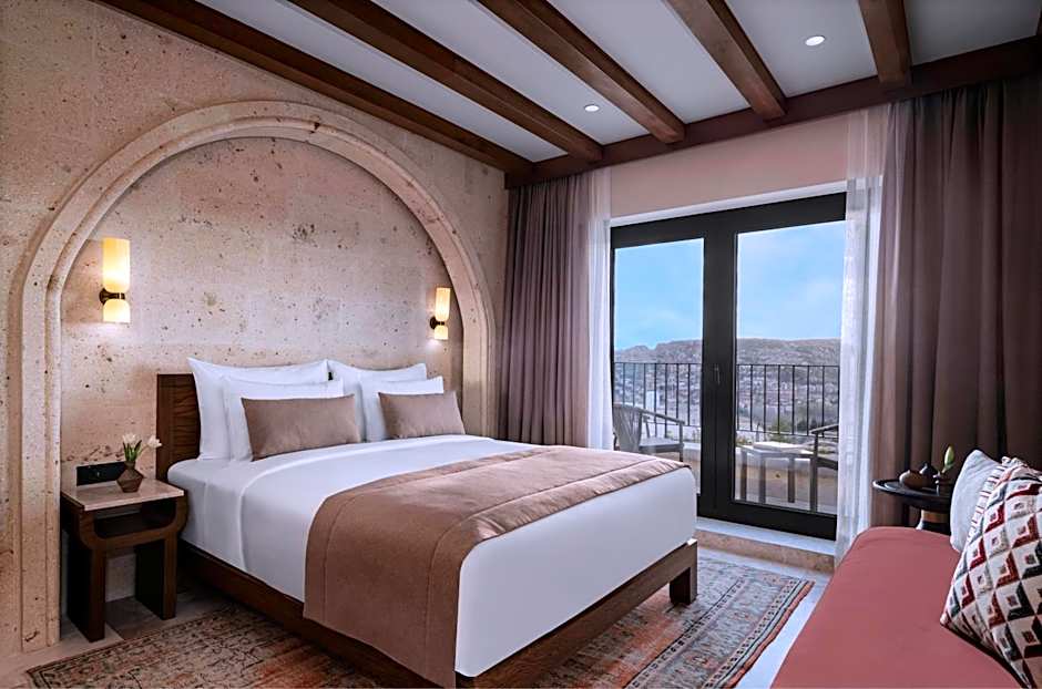 We have thought of all the details for your comfort in our Deluxe Cappadocia View Rooms furnished with special architecture and modern design. Our large, spacious rooms are 115 ft² and consist of King and Queen beds. Personal care set that will make you feel at home (bone comb, nail file, ear stick and make-up cotton, bathrobe, etc.) We offer the comfort of our luxury bouquets, which we have produced specially for Alden Hotel and our environment, to our valued guests. large bathtubs in our marble-lined bathrooms. You can enjoy the exquisite pleasure of our Nespresso coffee machines, with a variety of international TV channels such as Turkish, English, French, German, Spanish, Russian, Japanese, Arabic, safety deposit box and room card system in our rooms. You can relax in this elegantly designed room.