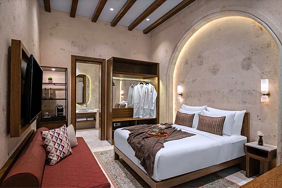 We have thought of all the details for your comfort in our Premium Cappadocia View Rooms furnished with special architecture and modern design. Our large, spacious rooms are 115 ft² and consist of King and Queen beds. We offer you, our valued guests, the pleasure of a rain shower in our luxury room covered with personal care set (bone comb, nail file, ear stick and make-up cotton, bathrobe, etc.), boucle and marble that will make you feel at home. Bathrooms specially produced for Alden Hotel. You can enjoy the exquisite pleasure of our Nespresso coffee machines, with a variety of international TV channels such as Turkish, English, French, German, Spanish, Russian, Japanese, Arabic, safety deposit box and room card system in our rooms. You can relax in this elegantly designed room.
