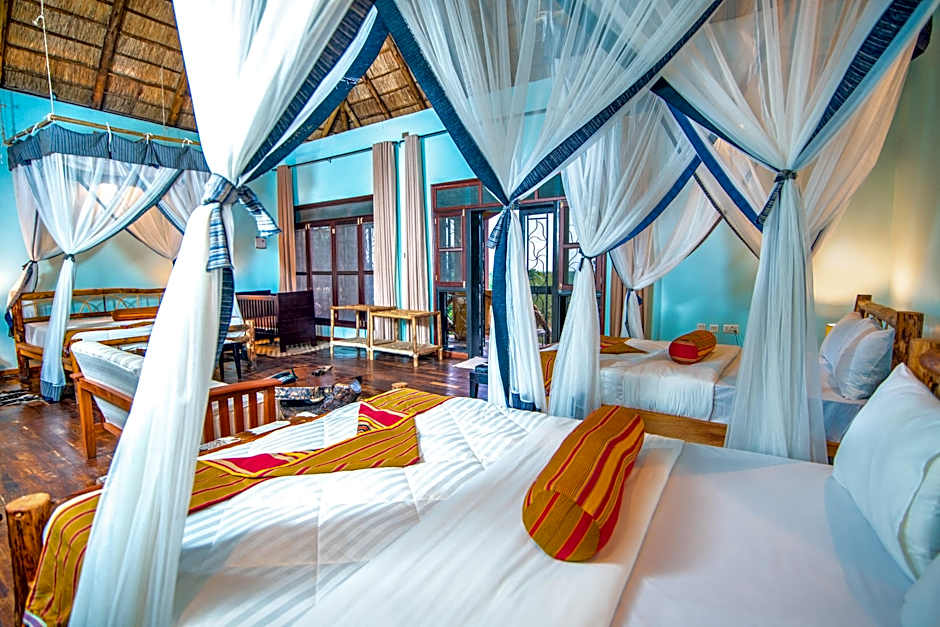 Imagine waking up to stunning mountain and garden views from your soundproof room or relaxing on the terrace with the warm Ugandan sun overhead. Families will delight in the kids' club and free kids' pool, while adults can enjoy the outdoor swimming pool, beachside relaxation with free beach umbrellas and loungers, or indulge in a massage (extra charges). The resort also boasts a private beach area, a lively restaurant, and a bar where you can sip your favorite drink while soaking in the sunset ambiance.