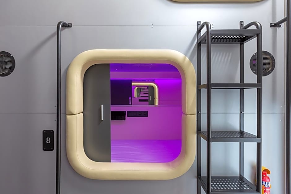 Room options lean playful and versatile: Capsule, Single dormitory capsules come in 22 sqft spaces with a twin bed, including male-only variants; a Capsule, Single, Female Only covers 44 sqft; Capsule, Double offers 43 sqft with a double bed. There are also Basic and Classic rooms, both non-smoking and accommodating 2 adults (no children).