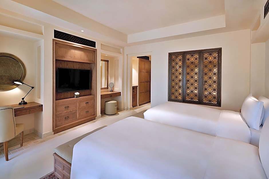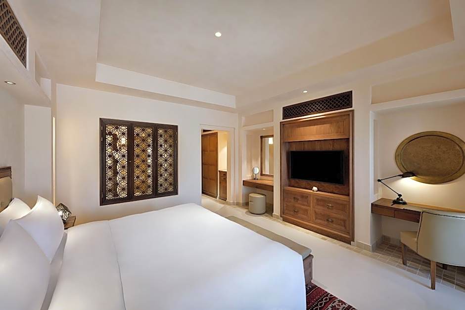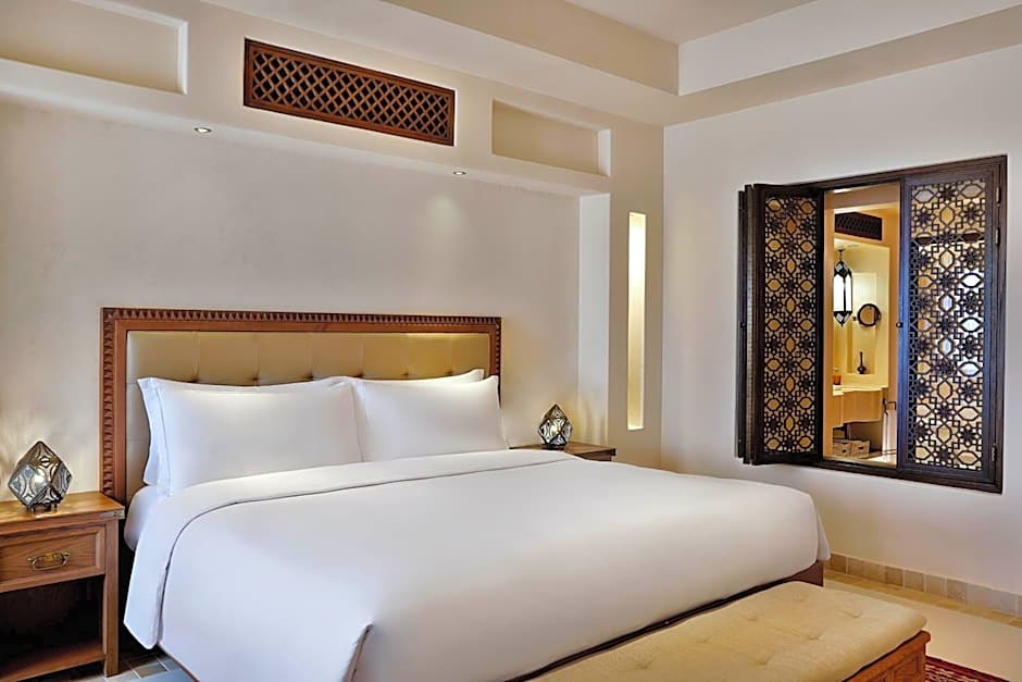 The 45 sqm room offers resort and courtyard views and is decorated in neutral tones and Arabesque inspired accessories.