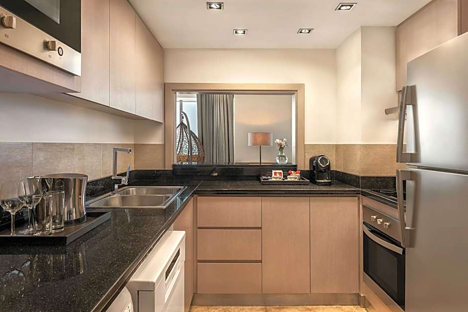Relaxation is easy with an outdoor heated pool available year-round. The pool is adults-only, offering a serene soak, while a separate kids’ pool provides splash-friendly fun. A sun deck invites lazy days in the sun, perfect for soaking up the Abu Dhabi rays.