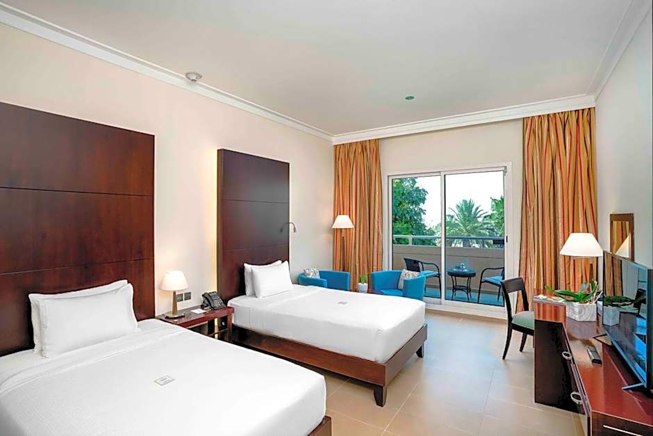The hotel offers two on-site restaurants: The Olive Branch Restaurant, known for its family-friendly and traditional ambience, serves international cuisine. Meanwhile, the Oasis Oriental Restaurant also provides a family-friendly and traditional atmosphere, offering Middle Eastern, pizza, seafood, and international cuisines.
