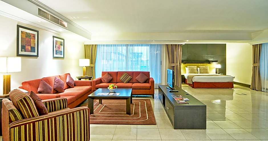 This open-plan suite features a small living room with a satellite TV and a mini-bar.