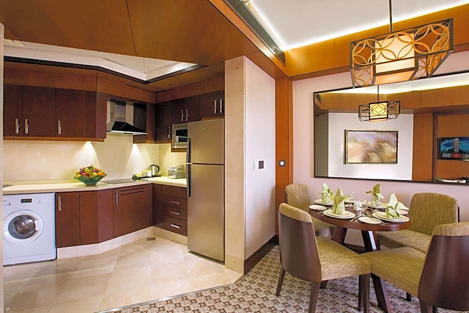 This spacious landmark view fully furnished suite with a separate living room and fully equipped kitchen with a washing machine and a full size refrigerator. It features two large LED TVs, complimentary WiFi and luxury amenities.