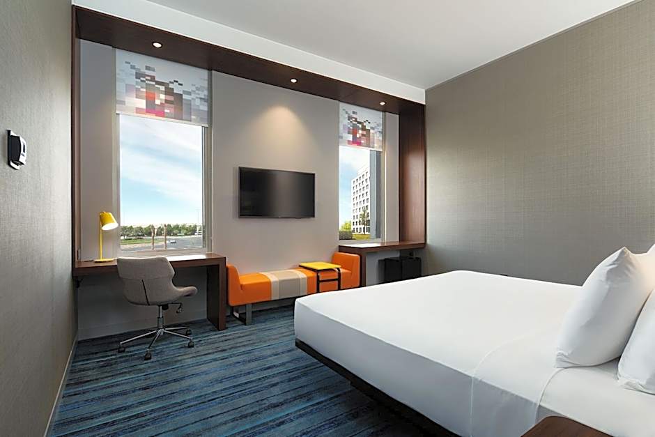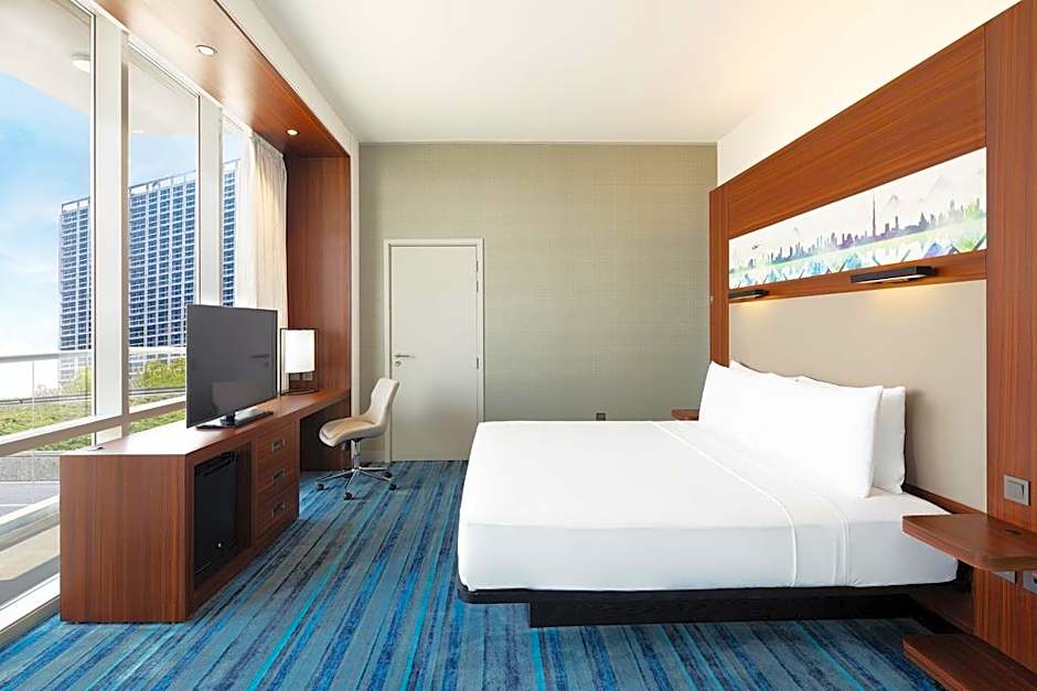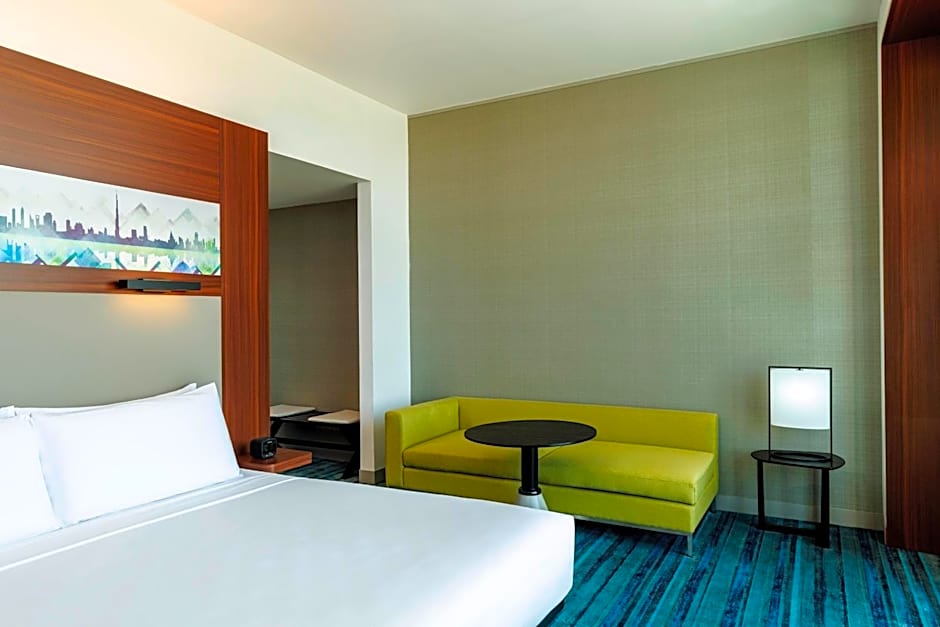The hotel offers Aloft Rooms with a King Bed and Twin Bed, both of which include complimentary shuttle service to the Expo Metro Station and Al Maktoum International Airport. The King Bed rooms accommodate 2 adults and 1 child, the Twin Bed rooms have the same capacity, and all these room types are non-smoking. The Savvy Suite features a King Bed, a living room, and two bathrooms, accommodating 3 adults and 2 children in a 570 sqft space, also with a no-smoking policy.