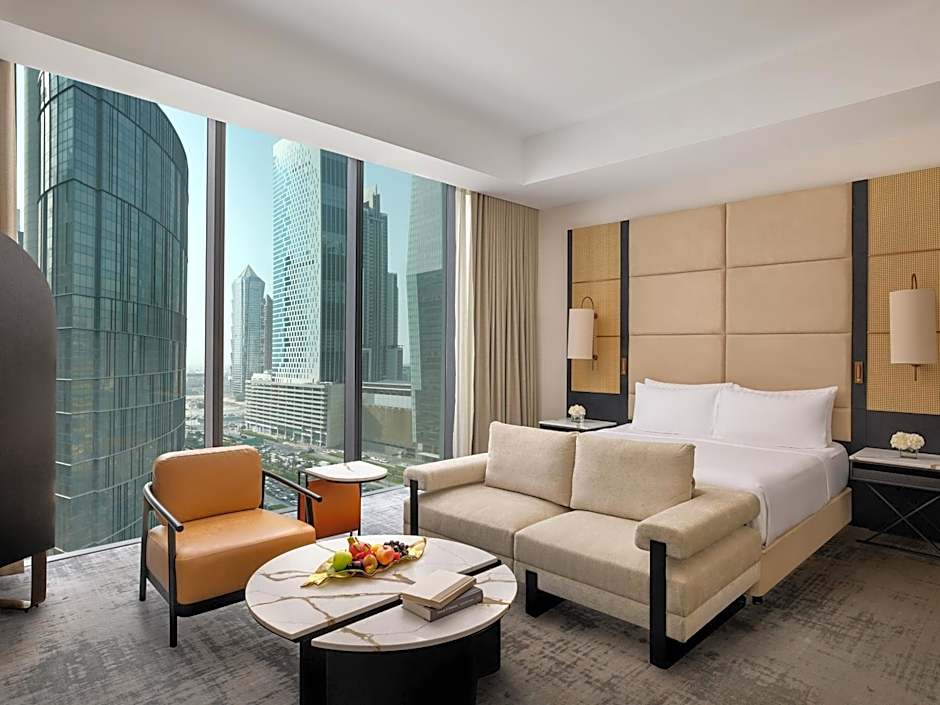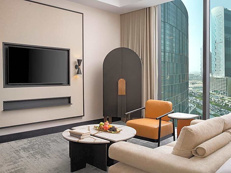 This spacious elegant suite is located on the higher floors and features a bedroom, a spacious living room that extends onto a balcony with floor-to-ceiling windows overlooking Business Bay. It includes a flat-screen TV, free Wi-Fi, a mini-bar, tea and coffee making facilities. The private bathroom is well appointed with a walk-in shower, a separate bathtub, a bidet, a hairdryer, and plush slippers for added comfort.