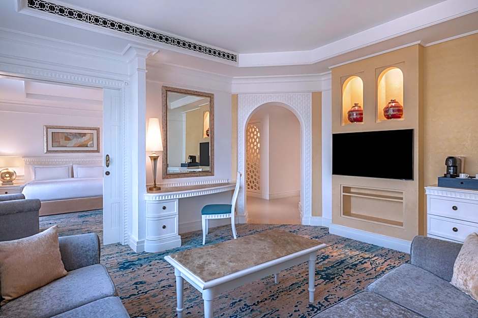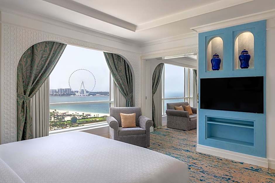 This air-conditioned 65 square yard Tower Family Suite with Partial Sea View offers a king size bed and features a separate living room with satellite flat screen TV, seating area and a work desk. The bathroom offer a bathtub and a separate shower and complimentary toiletries.