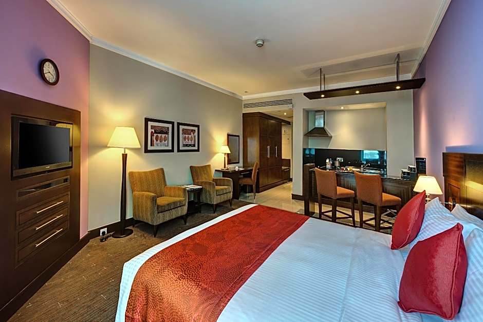Overlooking the city and enjoying corner locations within the property the one bedroom suite benefits from natural light and features a generous 64 sqm of flexible space. Dark wood and rich colors complement soothing ceramic floors and soft lighting to create a relaxing setting. Guests enter the suite via a spacious hallway which opens onto the living/dining space with dining table and chairs. A comfortable sofa and armchair and fully integrated LCD TV lends itself to a much needed escape at the end of a hectic day.