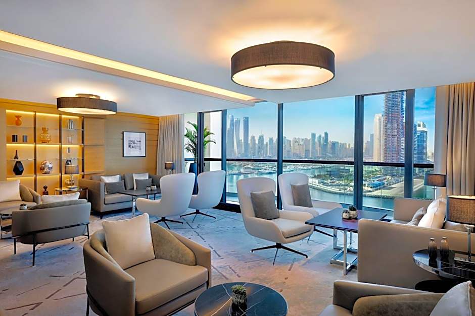 The hotel offers a variety of room types including Executive King, Deluxe Double, and Family Suite with different occupancy options ranging from 2 adults to 6 adults and 5 children. All rooms are non-smoking and feature bed sizes of King, Double, and Double Beds with varying room sizes from 441 sqft to 1367 sqft. The suites come with Club Lounge access offering complimentary afternoon tea, evening cocktail hours, and canapes.