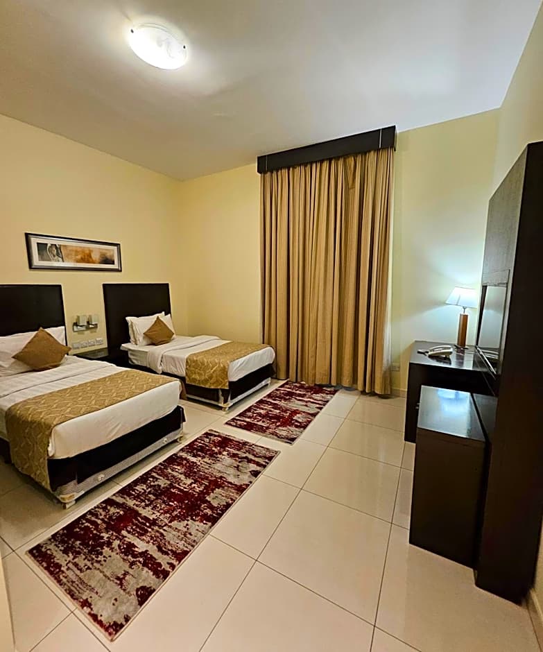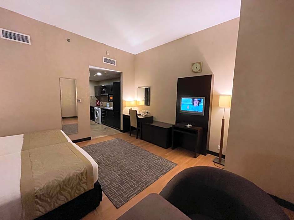 Comfortable studio for 2 adults with choice of queen bed or twin beds. Features a fully equipped kitchen, fridge, washing machine, flat TV, safety box, and modern bathroom. Includes cleaning service, 24/7 security, and front desk support—perfect for a relaxing stay.