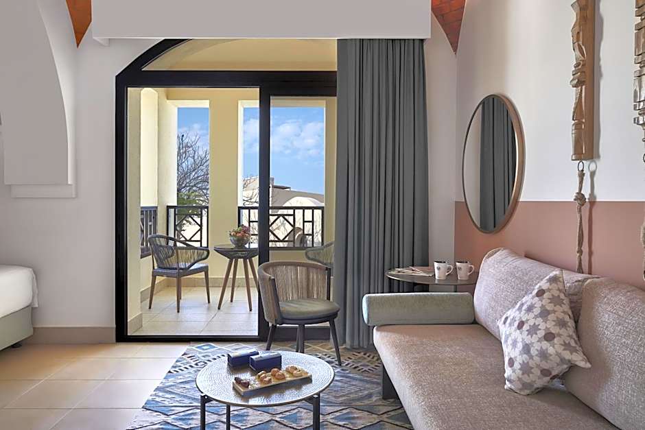 Overlooking the Arabian Gulf and the beach, the Premium rooms are ideally located on the left side of the resort in clusters. All the rooms are cozy, designed with a distinctive Nubian touch. King bedded, the rooms also feature a sofa under a high arched ceiling and include a private balcony.There is no capacity for an extra bed in this room category.