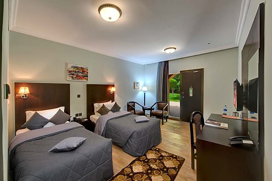 The Sharjah Carlton Hotel offers a variety of rooms including standard rooms, suites, and deluxe rooms. Occupancy ranges from single occupancy to family suites accommodating up to four guests. Room sizes vary with options for king or twin beds, and most rooms are non-smoking.