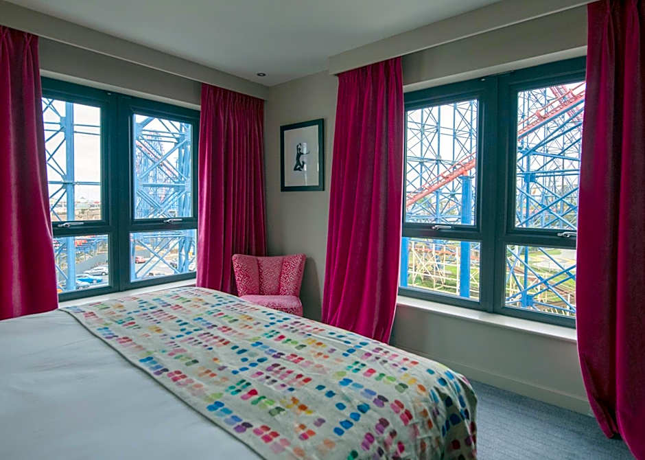 This suite offers views of the thrilling rides of Blackpool Pleasure Beach and features a separate living room, luxury designer toiletries, bathrobes and slippers for use during stay, espresso machine, feather duvets and pillows and Designers Guild fabrics. Guests receive a bottle of prosecco in room for arrival when booking this room type.