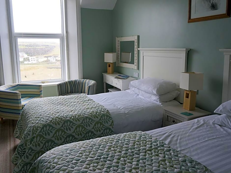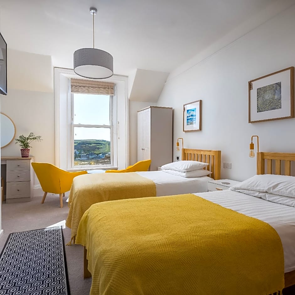 A first-floor large standard twin room with a double bed and a single bed and a Smart TV. The en-suite shower room has Cornish toiletries. Large bath sheets, hand towels and a hairdryer are also included.