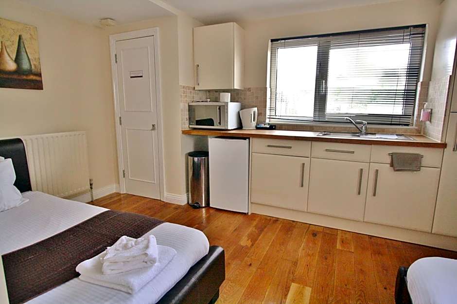 Each room has a kitchenette with a combi microwave featuring grill and oven functions, a full-size fridge, large worktop with sink (no hob or oven), wall-mounted LCD TV with Freeview channels, a full-length mirror and hairdryer. Cutlery, plates, and cups are provided.