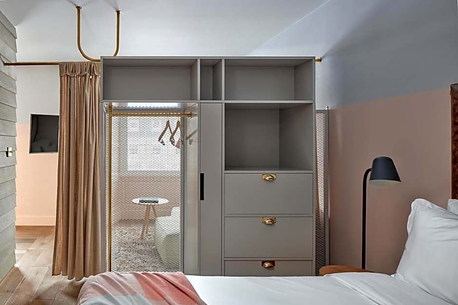 We call our 92 ft² Locke Studios our ‘standard rooms'. But with plenty of space to sleep, eat and live, they’re not your average boutique hotel room. ‏‏‎ ‏‏‎ ‎ You’ll have a king-size bed, as well as an iconic green L-shaped sofa for relaxing on. A fully-equipped kitchen with marble dining table, hob, washer/dryer, fridge/freezer and dishwasher, as well as lots of designer cooking gear.