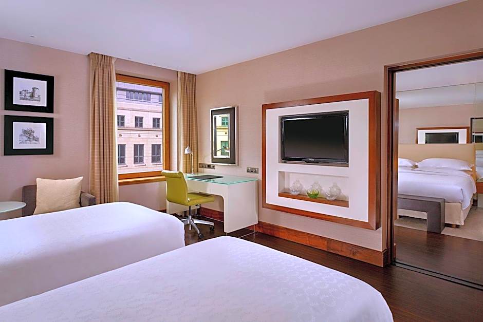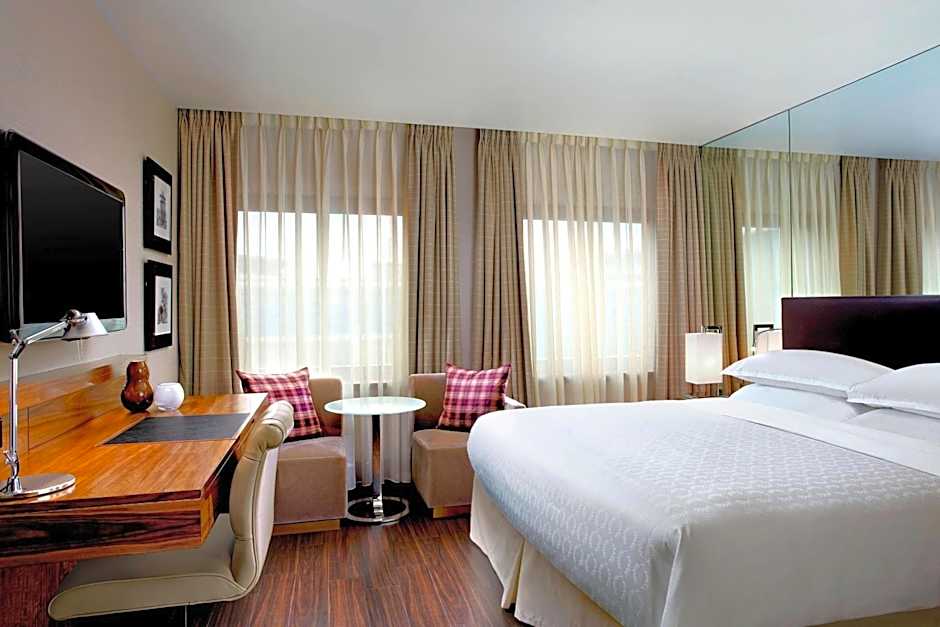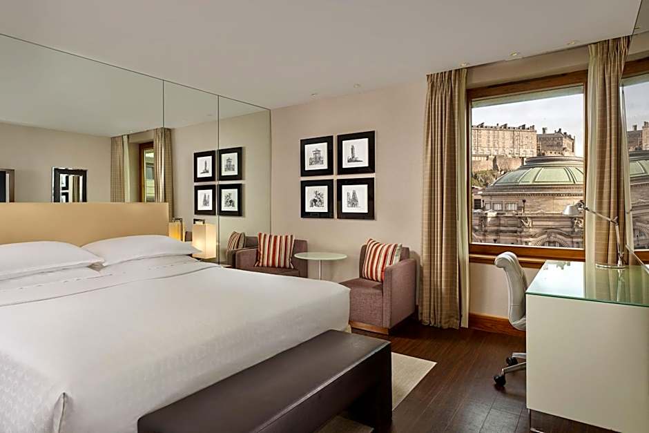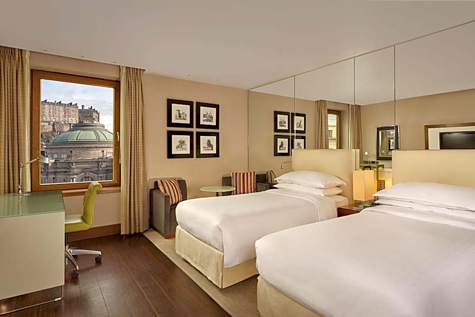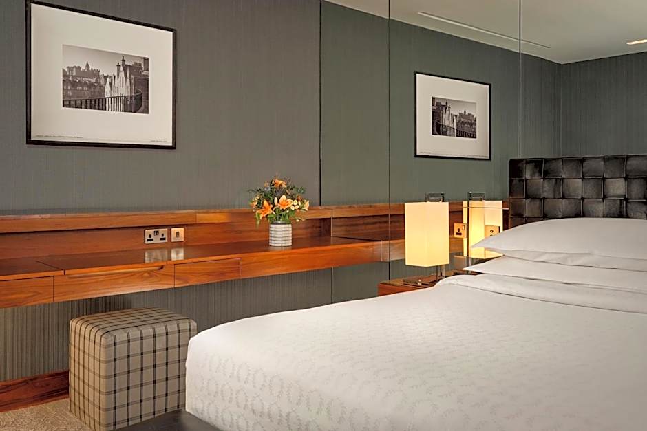 The Sheraton Grand Hotel & Spa offers a variety of room options including Sheraton Suites, Club Rooms, Castle View Deluxe Rooms, and Castle Suites. All rooms have a minimum size of 280 sqft and accommodate 2 adults and 1 child. Smoking is not allowed in any of the rooms. The beds available include either 1 King size bed or 2 Twin beds.