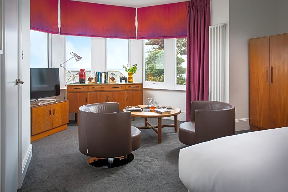 Dedicated to David Bowie, this second-floor room has a private balcony and extensive sea views. This large room has a king-size bed with feather bedding, cotton linen and slippers. It also has a sitting area with a two-seater sofa and arm chair. There is a smart flat-screen TV, DAB radio and range of coffee, specialty teas and hot chocolate with biscuits, fridge with bottled water and fresh milk. The large en suite has a walk-in power shower and complimentary toiletries.
