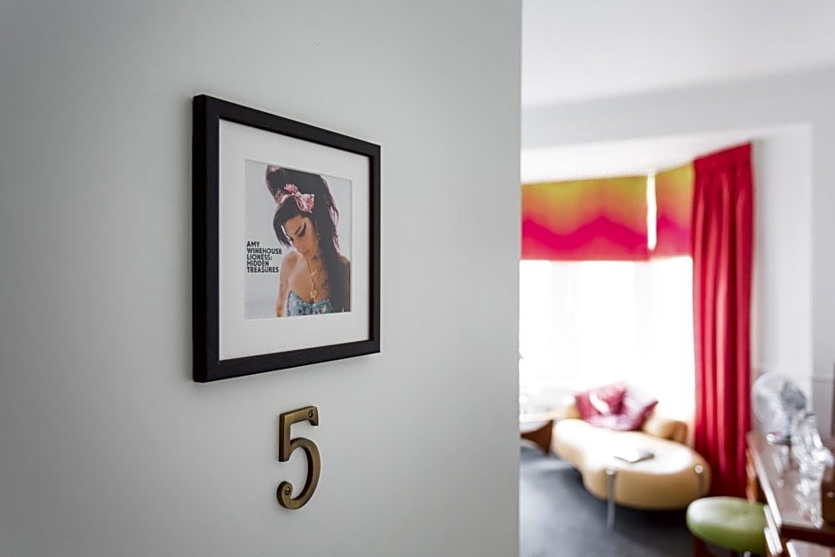 Dedicated to Amy Winehouse, this bedroom has a super king-size bed and guests can sit on the chaise longue, relax and enjoy the sea view from the side bay window. This room can be set up as a double or twin room, with feather bedding and cotton linen. The smaller en suite has a power shower and complimentary toiletries. There is a flat-screen smart TV, DAB radio and a range of coffee, specialty teas, hot chocolate and biscuits. The fridge is stocked with bottled water and fresh milk.