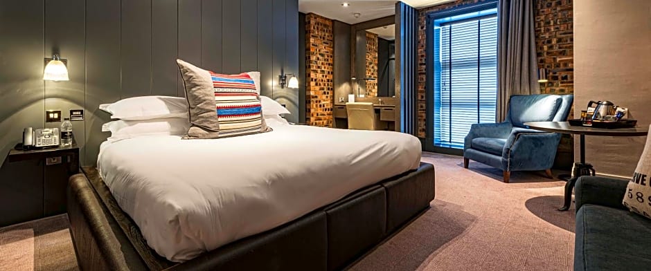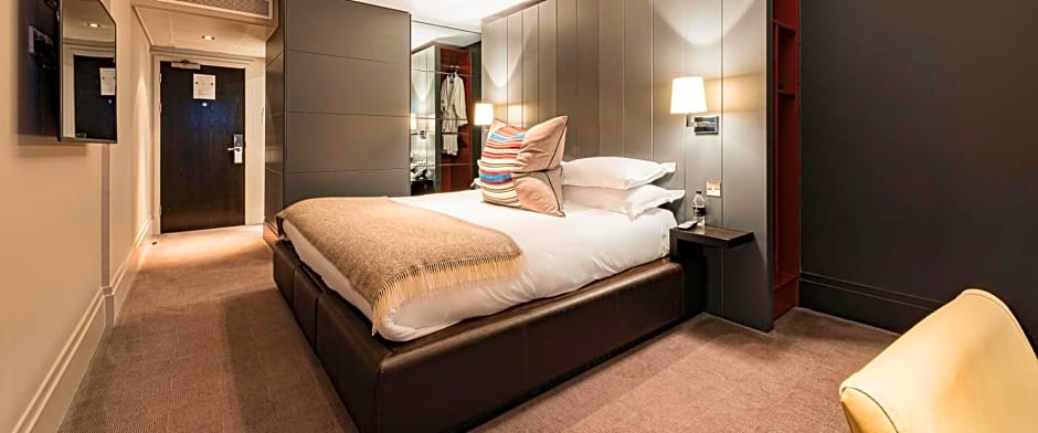 Elegant contemporary Deluxe Room with a super-king-size bed, space to lounge and relax, and a HDTV with Sky Package, Sky sports and Sky movies. In room amenities include a smart HDTV with full Sky Package including Sky Sports & Sky Movies, desk & chair, complimentary stocked mini-bar, hairdryer, iron & ironing board, air-conditioning, Wi-Fi, bathrobes & slippers, luxury toiletries, Nespresso machine, tea & coffee tray with cafetière & bottled water.