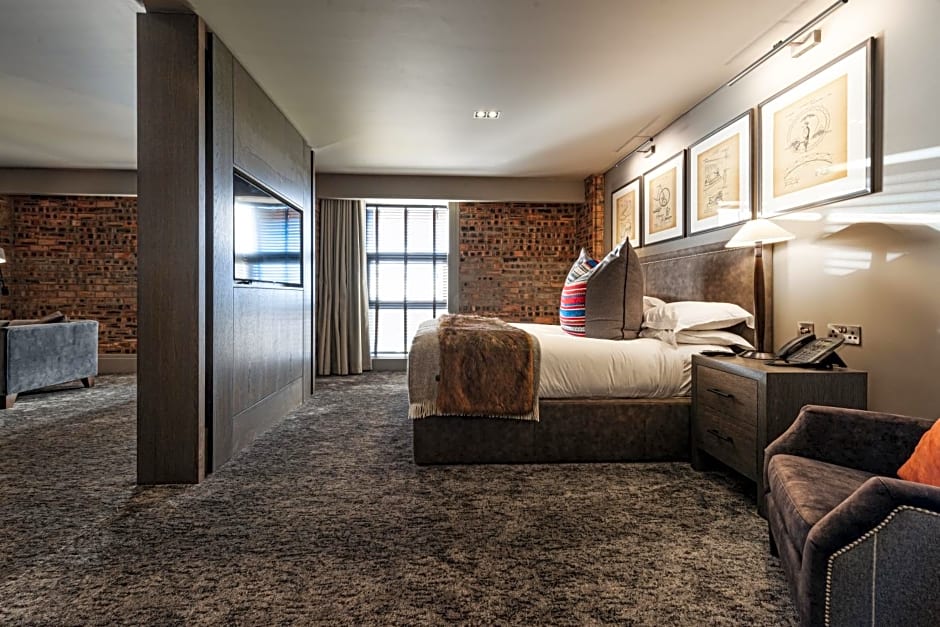 Spacious suite with a large lounge and bedroom area featuring a luxurious super-king size bed, private bathroom complete with rainfall shower and a separate bathtub, complemented by a walk-in wardrobe. In room amenities include complimentary stocked mini-bar, HDTV with Sky package including Sports & Movies, Nespresso machine, ensuite rainfall shower, evening chocolate turndown, tea and coffee tray with bottled water, bathrobes & slippers, crisp cotton linen and sumptuously soft bedding, luxury toiletries, iron & ironing board, complimentary WiFi, hairdryer.