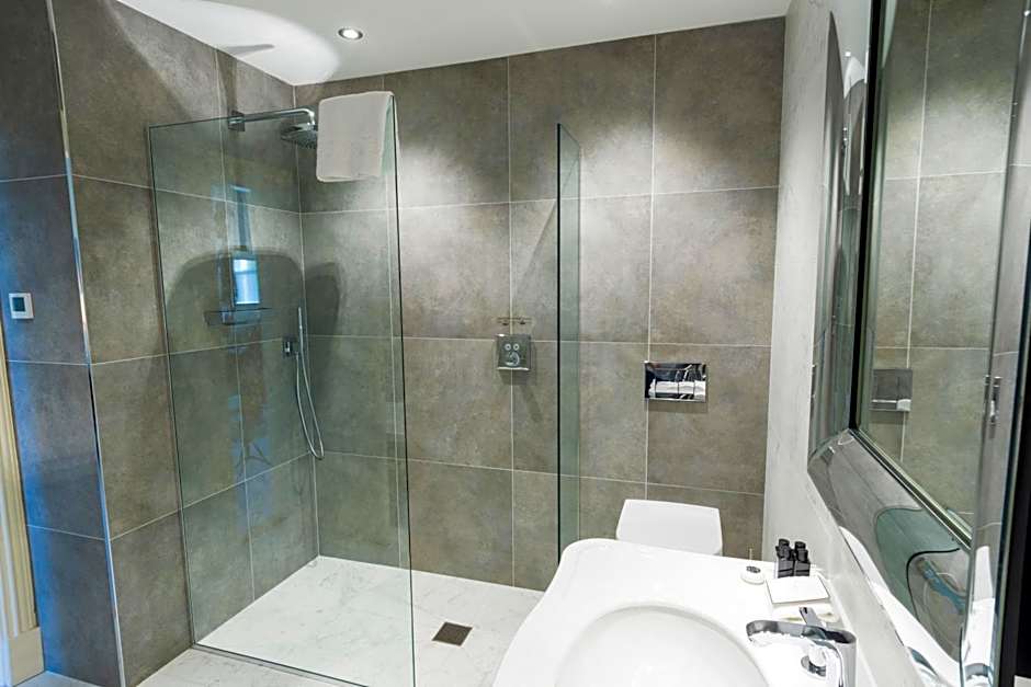 The superior double or twin room features contemporary amenities with traditional decor, and contains a larger seating area, TV, Nespresso machine, and private bathrooms with a wet rooms. These rooms have woodland views.