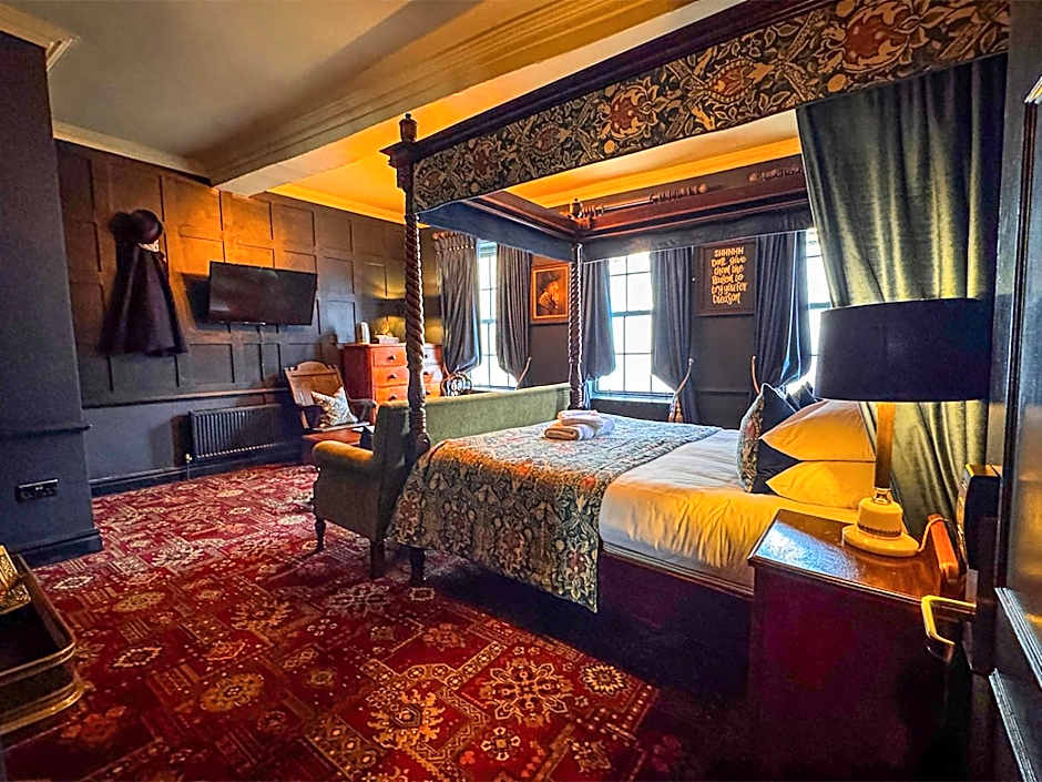 The Guy Fawkes Inn offers a variety of room options, including Executive Double Rooms, Double Rooms with Courtyard Views, Deluxe Double Rooms, Double Rooms with Four Poster Beds, and Suites with Double Beds. All rooms are non-smoking and can accommodate 2 adults and 1 child. The room sizes range from 108 sqft to 237 sqft. All rooms are equipped with 1 double bed.