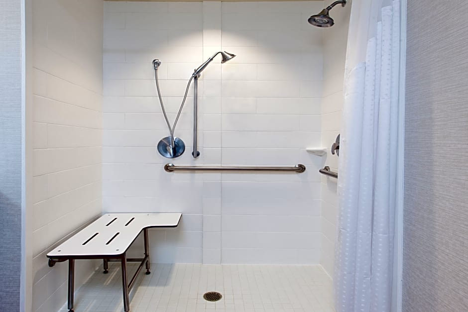A cable TV, microwave, and small refrigerator are featured in this accessible room. Visual door and telephone alarms are also included.
