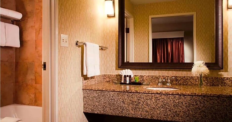Free Wi-Fi, a 42-inch flat-screen TV, a private bedroom, and a separate seating area with sofa bed, armchair and work desk are provided in this 2-room suite. A wet bar with granite counter tops, refrigerator, microwave and coffee-maker is included.