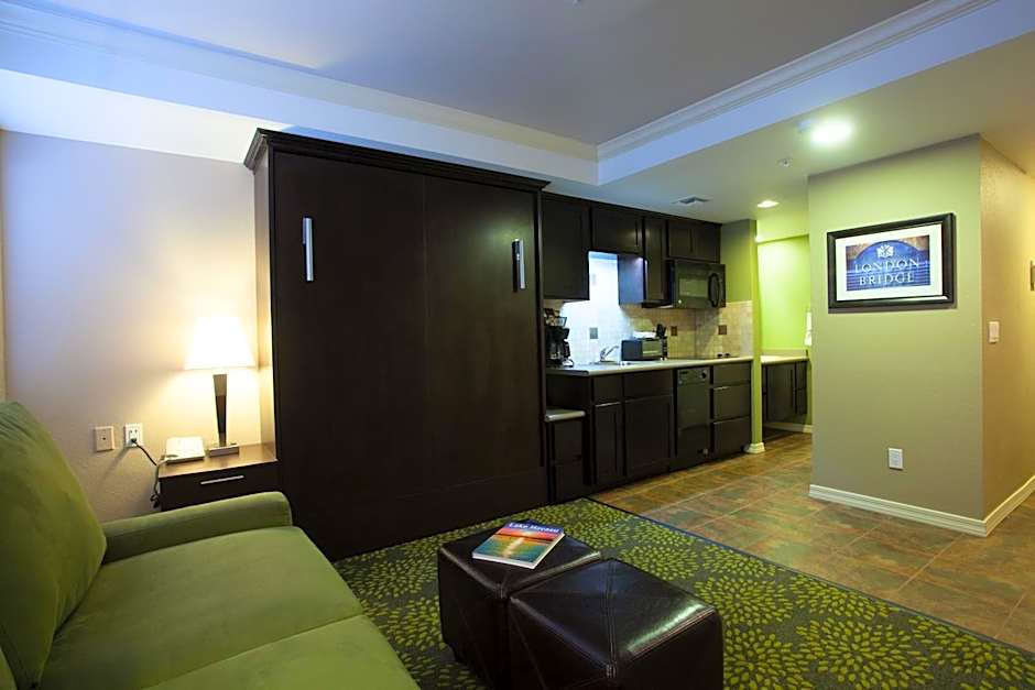 London Bridge Resort offers a variety of room types, including Studio Suites with queen murphy beds, One-Bedroom Queen Suites with queen beds and sofa beds, and Two-Bedroom Resort Suites with queen beds and a sofa bed. Smoking is not allowed in any of the rooms. The occupancy ranges from 2 adults and 1 child for the Studio Suite to 6 adults and 4 children for the Two-Bedroom Resort Suite.