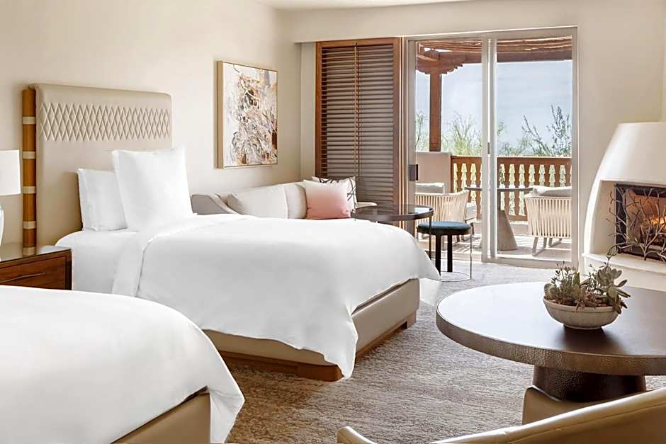 The hotel offers a variety of rooms including Premier Casita Rooms with two double beds or a king bed, One-Bedroom Kiva Plunge Pool King Suites, Two Bedroom Suites, Vista Casita Rooms with two double beds or a king bed, Patio Fire Pit Casita Rooms with two double beds or a king bed, Reata Pass Suites with a king bed, Pinnacle Suites with three bedrooms, One-Bedroom Oasis Plunge Pool Twin Suites, Desert Garden Suites with a king bed, One-Bedroom Kiva Plunge Pool Twin Suites, and Deluxe Casita Rooms with a king bed. Smoking is not allowed in any of the rooms. The rooms accommodate between 3 adults and 2 children to 6 adults and 4 children.
