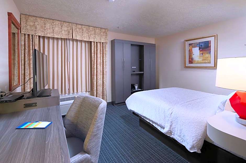 Any corresponding photo may not reflect the specific accessible room type or room feature. This mobility and hearing accessible, nonsmoking room features one king sized bed , and an accessible roll-in shower. The room also has a visual alarm and notification devices for the doorbell or door knock and incoming phone calls. The room features comfortable soft seating, microwave, refrigerator, a HDTV, and easy to operate alarm clock/radio. The free high speed internet access will help you stay connected while on the road. If you prefer not to work at the desk, you can use the convenient lapdesk instead. You'll also enjoy the convenience of having a coffee maker with tea service and iron/ironing board in your room.