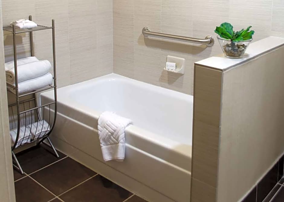 A spacious seating area with arm chair and sofa bed is featured in this suite. Free Wi-Fi, a 40-inch flat-screen HD cable TV, microwave, small fridge, wet bar, laptop safe and MP3 player are also included.